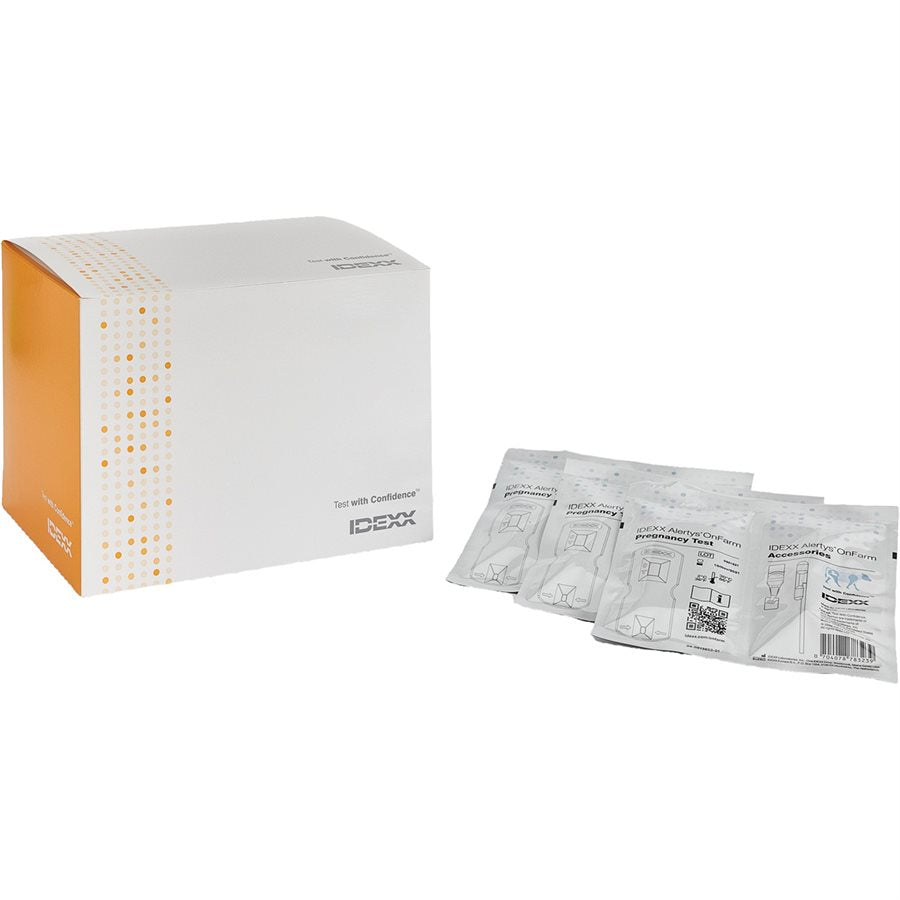 The IDEXX Alertys™ OnFarm Pregnancy Test is a rapid and reliable method for detecting pregnancy-associated glycoproteins (PAGs) in whole blood (EDTA), plasma (EDTA), or serum of cattle, goats, and sheep as a marker of pregnancy. This convenient on-farm test helps increase safety for both workers and animals, provides results within minutes, and makes it easier to identify open animals quickly. The results are clear and straightforward, allowing for confident decision-making without the subjectivity and extensive training required by traditional methods. For best results and to ensure proper herd management, it is recommended that this test be used in consultation with your veterinarian. Blood samples are collected from the underside of the tail using a needle, syringe, and EDTA tube (not provided), and results are available within 20 minutes, making the process both efficient and convenient. Can be stored at temperatures between 2°C and 30°C.