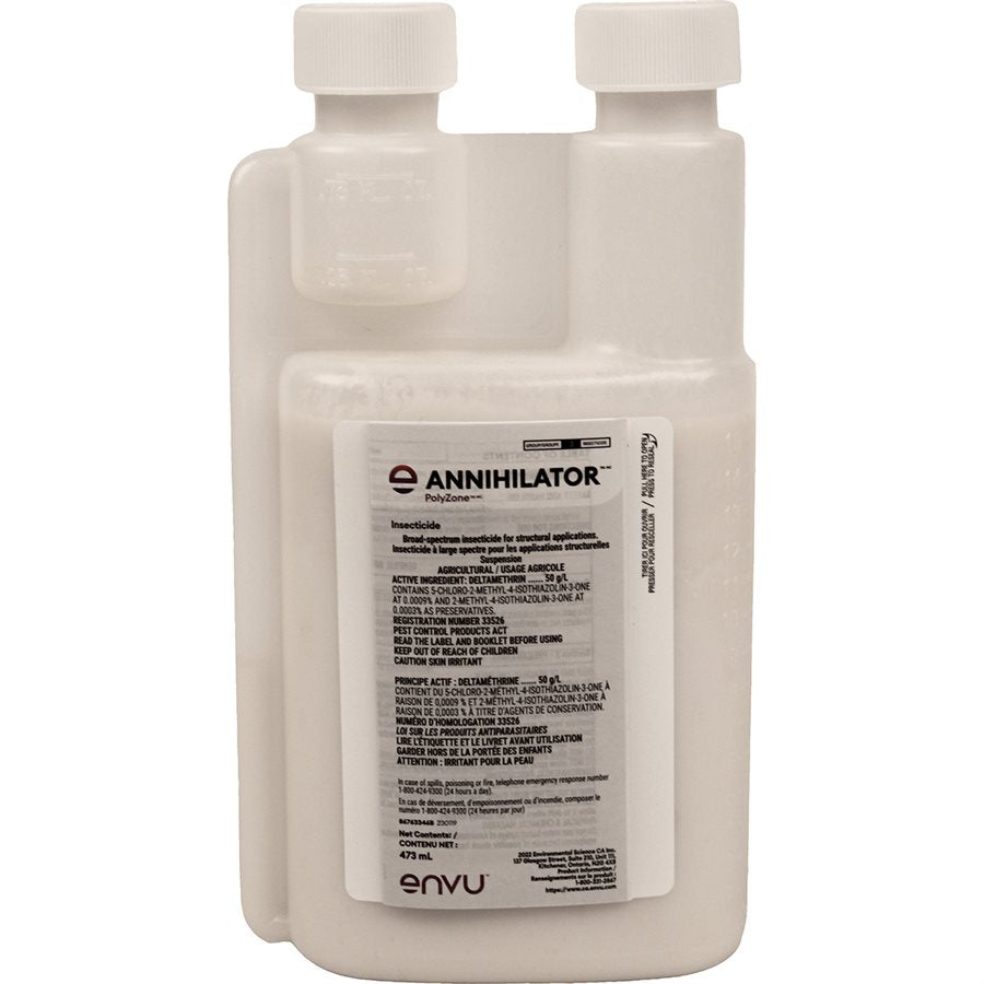 Annihilator POLYZONE insecticide is a liquid concentrate to be used as a premise spray to provide broad-spectrum control of crawling and flying pests, including flies, darkling beetles, mosquitoes, and ticks. With proprietary POLYZONE technology, the active ingredient, Deltamethrin is proven to resist adverse weather conditions and wash-off. This results in controlled, slow release "kill zone" technology that stands up to the elements and slows the wearing down of the active ingredient. Can be used inside or outside. Cannot be used on animals. One bottle can treat a surface up to 60,000 square feet with a residual of up to 12 weeks. PYRETHROID. ACTIVE INGREDIENT: 5% Deltamethrin. GROUP 3 INSECTICIDE.