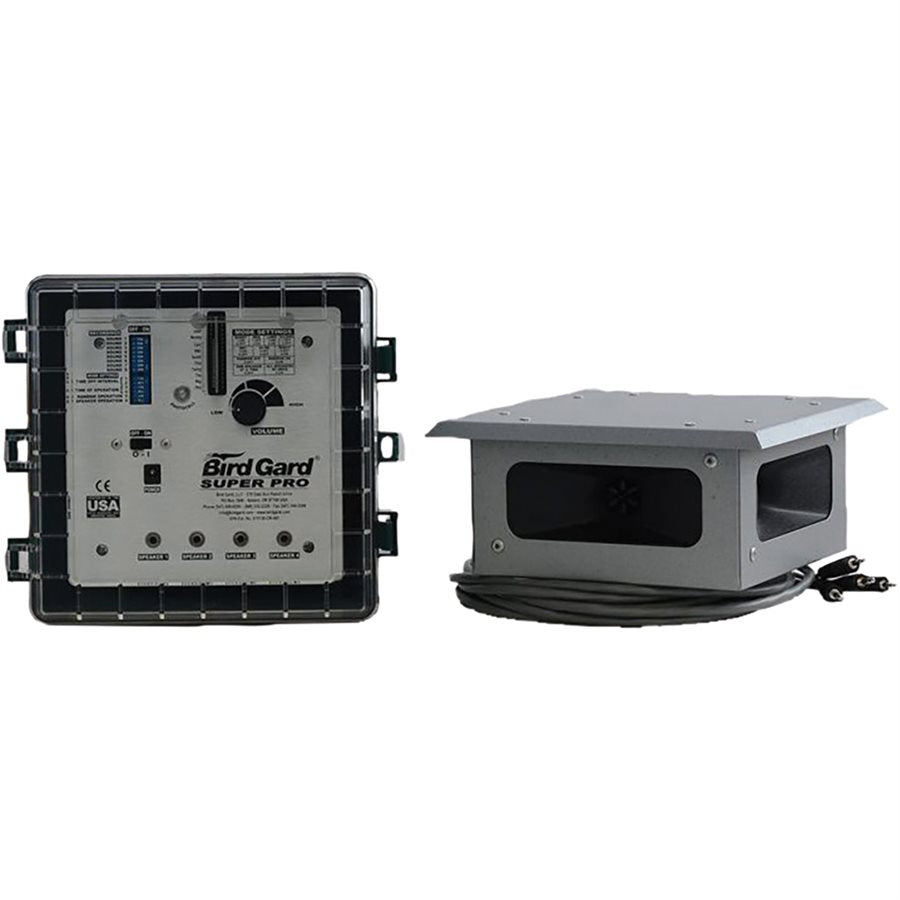 Bird Gard Super Pro is designed to cover an area of up to 500 feet in diameter and features a box with four speakers a built-in amplifier for high volume, and a crystal-clear digital sound output. With an enhanced random feature for speaker selection and sound frequency, as well as a user replaceable EPROM recording chip that can easily be changed to use different sounds. Mounts easily to a post or pole using that included mounting hardware and brackets. The generating unit features solid-state electronics mounted inside a NEMA-type control box for weather protection. Chip #210 and #90 are included and can be used interchangeably to increase your success. The Bird Gard solution must be customized to your operations needs. Mark Reynolds is our Bird Gard national product specialists. If you would like to purchase a Bird Gard, please call Farmers Depot @ 1-866-527-6229.