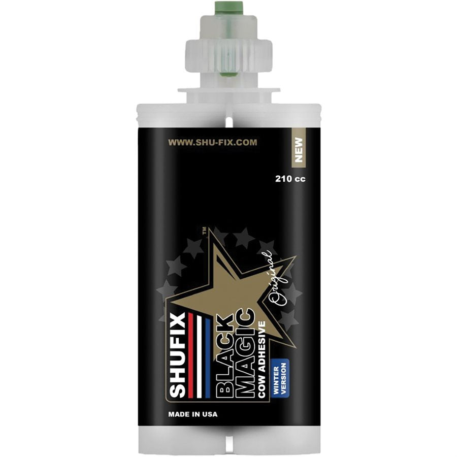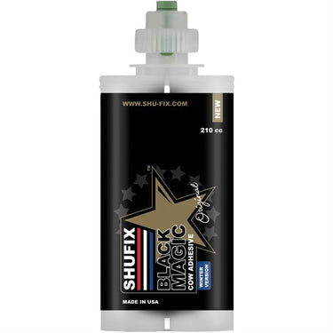 Black Magic is a revolutionary dark adhesive with super strength, especially developed for professional use on cattle to glue wooden, plastic or rubber blocks underneath claws. To maintain its magical characteristics, Black Magic Winter Version is recommended for use when temperatures are below 10 degrees C. Black Magic is a fast-curing polyurethane adhesive with a guaranteed solid adhesion. Block must be applied within 15 seconds to not disturb the curing process. After 90 seconds glue is cured and ready to bear weight. Store the tube upright and hold the tube upright when opening. Universal tips, sold separately, are required for application. When placing glue into manual applicator gun, place the darker side of the tube into applicator gun with the two rods that push the glue and therefore the lighter side of the tube into the applicator gun with the single rod that pushes the glue. Experience has shown to have a higher performing mix when the cartridge is loaded into the applicator like this. Feedback received from trimmers is that Black Magic glue should be at range of 18-23C prior to applying.