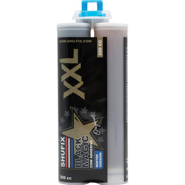 Black Magic is a revolutionary dark adhesive with super strength, especially developed for professional use on cattle to glue wooden, plastic or rubber blocks underneath claws. To maintain its magical characteristics, Black Magic Winter Version is recommended for use when temperatures are below 10 degrees C. Black Magic is a fast-curing polyurethane adhesive with a guaranteed solid adhesion. Block must be applied within 15 seconds to not disturb the curing process. After 90 seconds glue is cured and ready to bear weight. Store the tube upright and hold the tube upright when opening. Mixing Tips for Black Magic XXL 250 mL, sold separately, are required for application. When placing glue into manual applicator gun, place the darker side of the tube into applicator gun with the two rods that push the glue and therefore the lighter side of the tube into the applicator gun with the single rod that pushes the glue. Experience has shown to have a higher performing mix when the cartridge is loaded into the applicator like this. Compatible mixing tips are 691532 and 691533. Compatible manual applicator gun is 696514 and Battery powered applicator gun 691513. Conversion kits for the 210ml battery powered applicator guns are code 691534. There are no conversion kits for the manual gun. Feedback received from trimmers is that Black Magic glue should be at range of 18-23C prior to applying.