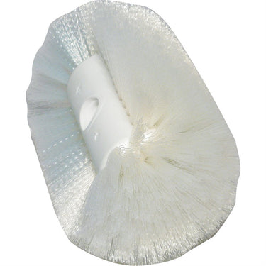 This bulk tank brush has been thoroughly tested and approved for use on dairy farms and creameries throughout the country. Plastic block has threaded, recessed handle hole for positive handle attachment. Type 6.6 white nylon bristles for soft scrubbing. Brush is 5-1/2" x 8-1/2" for faster cleaning. Fibreglass handle (912385) not included.