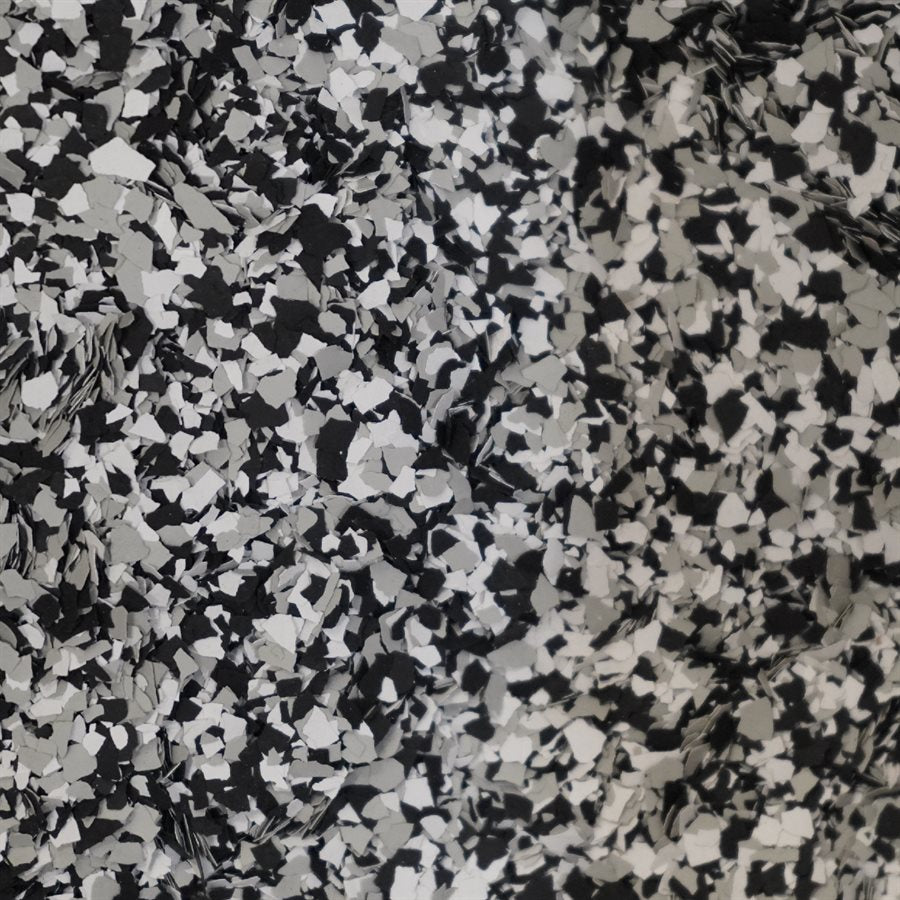 Domino flakes can be added to a coating project to add a diversity of colour to the project. Flakes are black, white and grey.