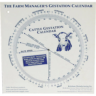 Gestation calendars are designed to allow the farm manager to determine birthing dates quickly and accurately. The manager needs only identify the date of conception and the calendar identifies the approximate birthing date. The printing is water-resistant and the plastic material is durable in harsh barn conditions.