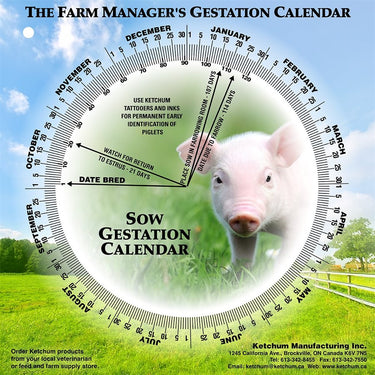 Gestation calendars are designed to allow the farm manager to determine birthing dates quickly and accurately. The manager needs only identify the date of conception and the calendar identifies the approximate birthing date. The printing is water-resistant and the plastic material is durable in harsh barn conditions.