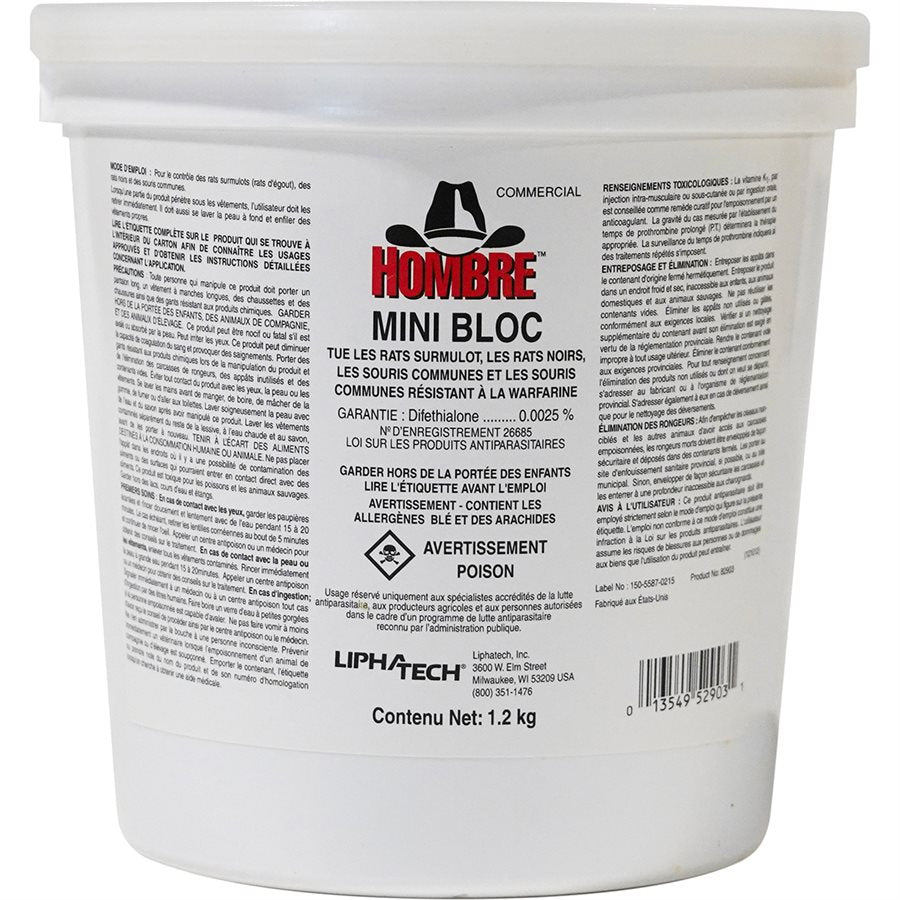 Hombre contains difethialone, a single-feed anticoagulant. A low concentration of a very effective active ingredient makes Hombre extremely palatable, ensuring that rodents consume a lethal dose quickly. Hombre gives off grain aromas while keeping moisture out. ACTIVE INGREDIENT: DIFETHIALONE (AT 0.0025%).