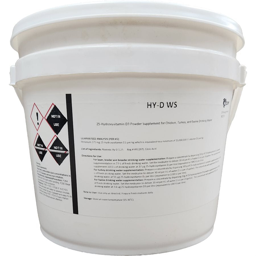For layer, broiler and breeder drinking water supplementation: Prepare a concentrate by dispersing 100 g of Hy-D®WS in 7.9 L of fresh drinking water. Set the medicator to deliver 30 ml per 4 L of water (1 oz per US gallon). This concentrate will supplement 1011 L of drinking water at 37 g 25-hydroxyvitamin D3 per litre (equivalent to 1480 IU per litre). For turkey drinking water supplementation: Prepare a concentrate by dispersing 300 g of Hy-D®WS in 15.8 L of fresh drinking water. Set the medicator to deliver 30 ml per 4 L of water (1 oz per US gallon). This concentrate will supplement 2022 L of drinking water at 55 g 25-hydroxyvitamin D3 per litre (equivalent to 2200 IU per litre).