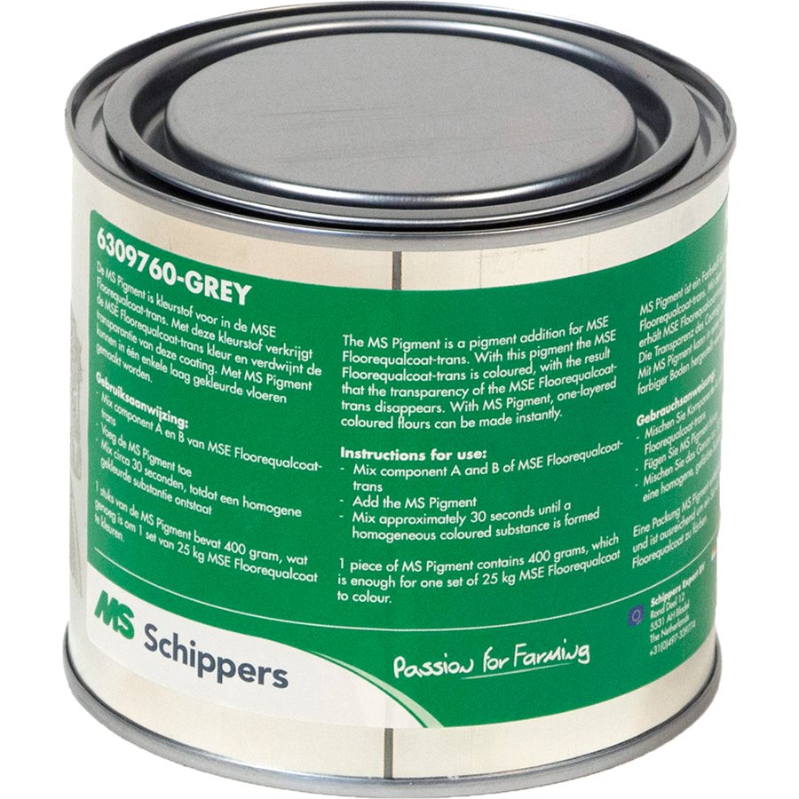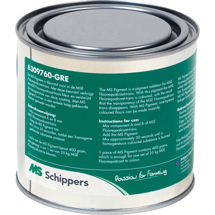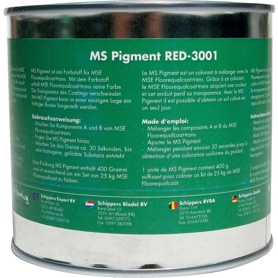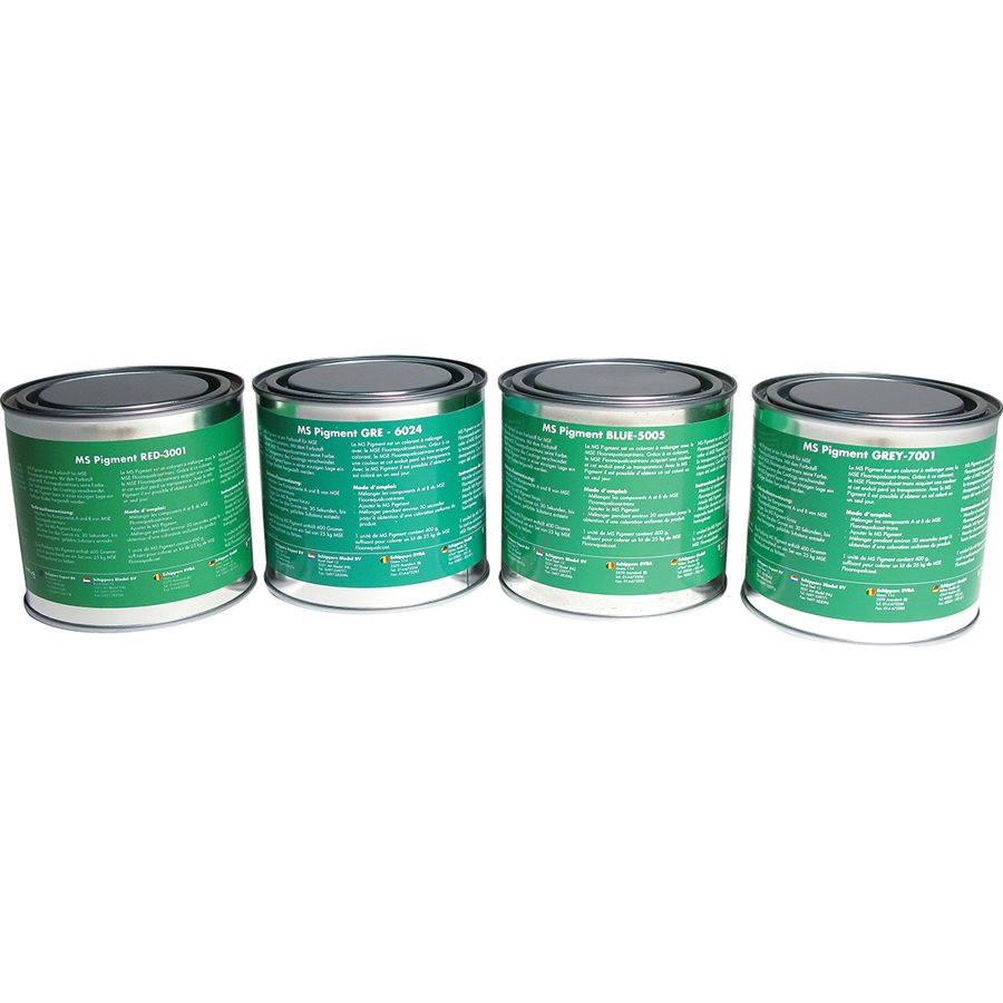 The MS Pigment™ is a pigment addition for MSE Floorequalcoat-trans™ (66309967-COMP-A and 66309967-COMP-B). With this pigment the MSE Floorequalcoat-trans™ is coloured, with the result that the transparency of the MSE Floorequalcoat-trans™ disappears. With MS Pigment, one-layered coloured floors can be made instantly. Use: Mix MSE Floorequalcoat-trans™ component A and component B for more or less 30 seconds. Add MS Pigment to the mixture and mix until the mixture is homogeneous. 400 grams MS Pigment™ is needed for a big package of MSE Floorequalcoat-trans™ (25 kg). 80 grams MS Pigment™ is needed for a small package of MSE Floorequalcoat-trans™ (5 kg).