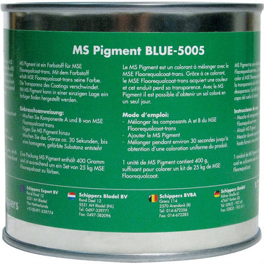 The MS Pigment™ is a pigment addition for MSE Floorequalcoat-trans™ (66309967-COMP-A and 66309967-COMP-B). With this pigment the MSE Floorequalcoat-trans™ is coloured, with the result that the transparency of the MSE Floorequalcoat-trans™ disappears. With MS Pigment, one-layered coloured floors can be made instantly. Use: Mix MSE Floorequalcoat-trans™ component A and component B for more or less 30 seconds. Add MS Pigment to the mixture and mix until the mixture is homogeneous. 400 grams MS Pigment™ is needed for a big package of MSE Floorequalcoat-trans™ (25 kg). 80 grams MS Pigment™ is needed for a small package of MSE Floorequalcoat-trans™ (5 kg).