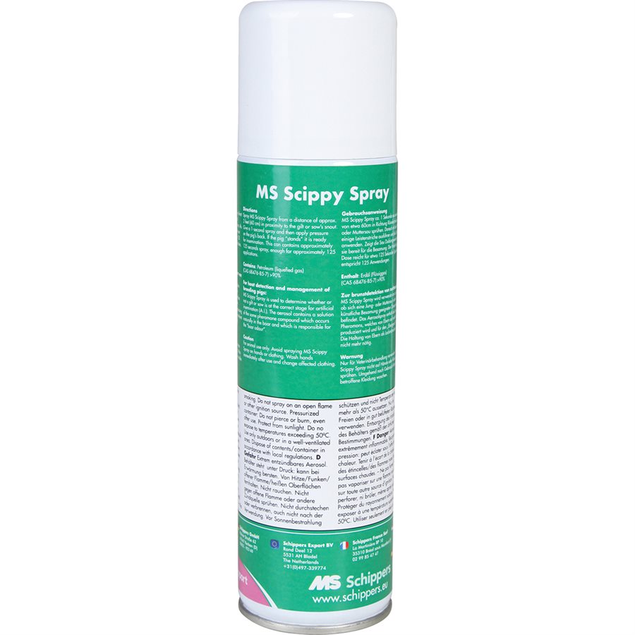 MS Scippy Spray™ is used to determine whether a gilt or sow is at the right stage to be artificially inseminated (A.I.). It stimulates rut, creates the ideal insemination moment, and increases the percentage of success. It encourages the potential standing reflex with additional stimulation during insemination. MS Scippy Spray™ contains a solution with the same composition that occurs naturally in boars and is responsible for the “boar odour”. Warning: Contents under pressure. Keep out of sun and do not expose to temperatures above 50°C. Do not puncture or drill, even after use. Do not spray in the direction of fire or burning objects. Keep away from objects that can ignite. Only for use on animals. Avoid spraying MS Scippy Spray™ on hands or clothing. Wash hands immediately after use and change soiled clothing. Do not inhale the spray. Users are directed to spray directly into the nostrils of the gilt or sow from a distance of roughly 60 cm, spray for 1 second and apply pressure to the back of the pig. If the animal exhibits a standing reflex, it is ready for insemination. The container has roughly 125 seconds worth of spray, enough for 125 applications.