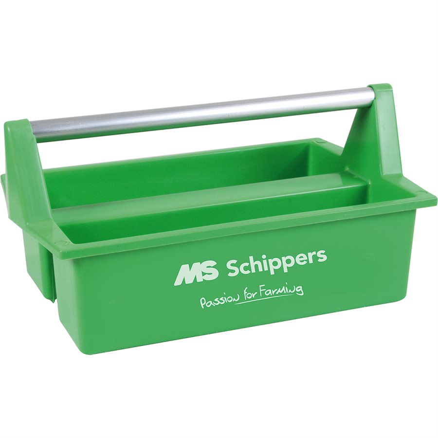 MS syringe and medicine box is plastic with an aluminum handle. It can be hung over a partition, divided in two sections, and is ideal for transport and storage of hypodermic syringes and medicines while working in a pen. The dimensions are 40 x 26 x 20 cm, with a handle at 20 cm, and a diameter groove of 5 cm.