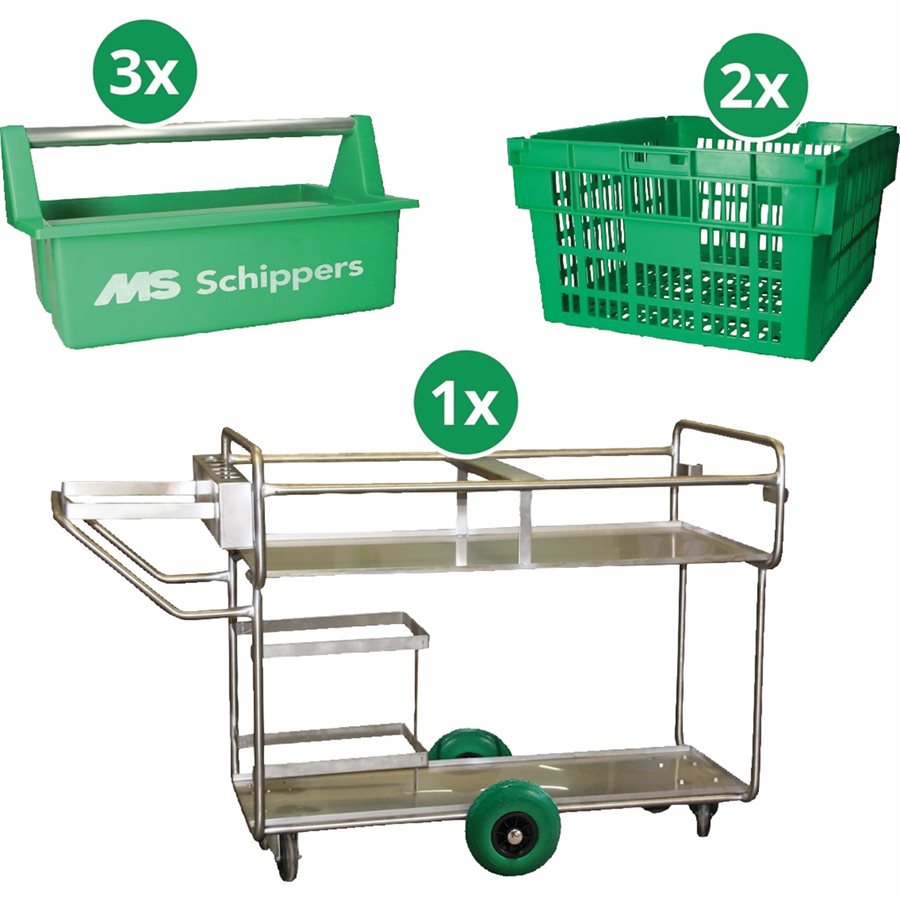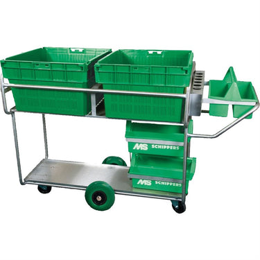 The MS Treament Trolley is a stainless steel trolley specially designed to efficiently monitor the health of piglets and to carry out necessary treatments. The MS Treatment Trolley includes trolley, 2 open piglet crates and 3 green MS tool boxes.