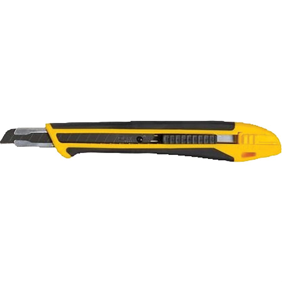 9mm knife with ergonomic handle made of fibreglass and elastomer rubber. Anti-slip grip and solvent resistant. Slide lock mechanism. Uses Olfa AB, ABB, AB-S and A1160B type blades. Features wrap-around rubber grip and curved finger stop handle to provide superior grip and better control for all cutting projects. Features an acetone-resistant handle for easy cleaning. Easy snap-off blade system always ensures you have a sharp edge. Versatile blade can be used to cut packaging, paint, wallpaper, caulking, foam board, and window film. Safely designed auto-lock mechanism helps prevent accidents on the job. Designed with a lanyard hole and pocket clip so you always have this utility knife ready on-hand.