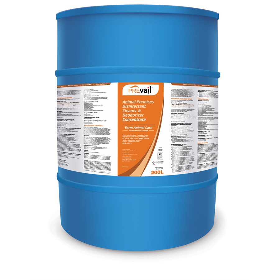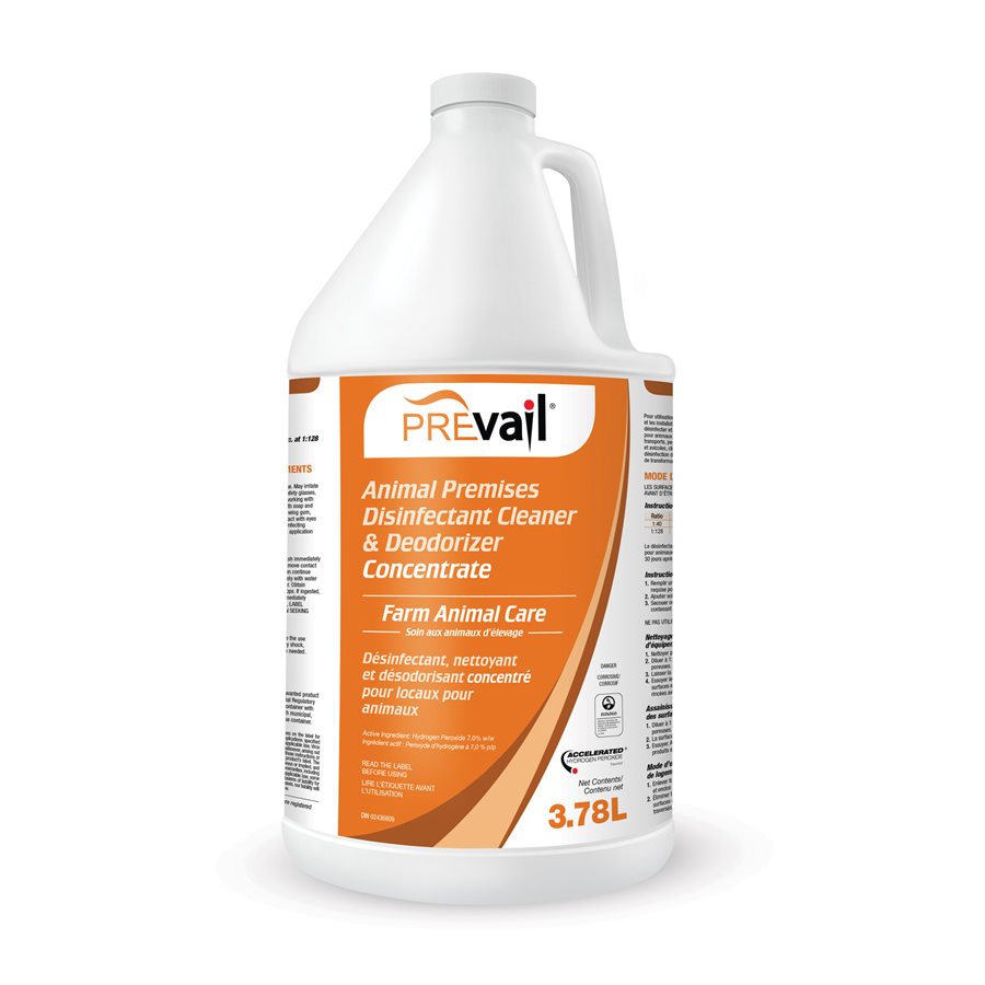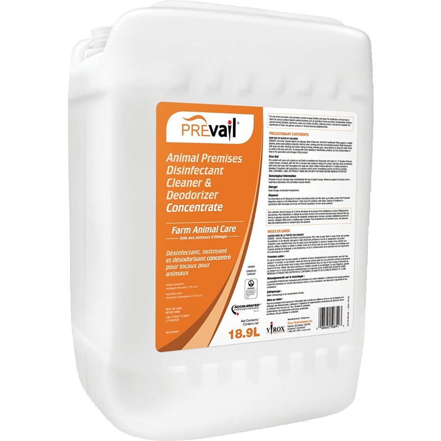 Prevail is a disinfectant based on a Canadian technology called Accelerated Hydrogen Peroxide (AHP). AHP was developed in order to keep the powerful disinfectant properties of hydrogen peroxide stable for long periods of time, thus increasing its disinfection efficacy. Producers are amazed at the amount of labour saved when using Prevail as its ability to lift fecal matter and clean surfaces is significant. Prevail is also a much more user-friendly disinfectant and does not require the use of personal protective equipment when being applied. Broad-spectrum sanitizing at 1:128. Disinfection 1:40.
