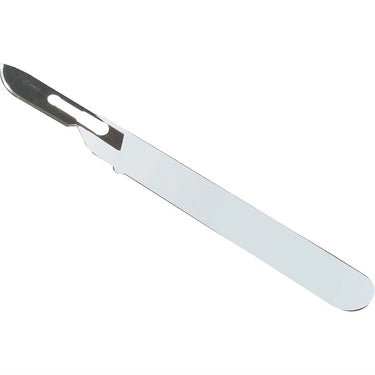 Sterile disposable scalpel with plastic handle and stainless steel blade.