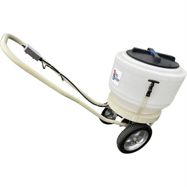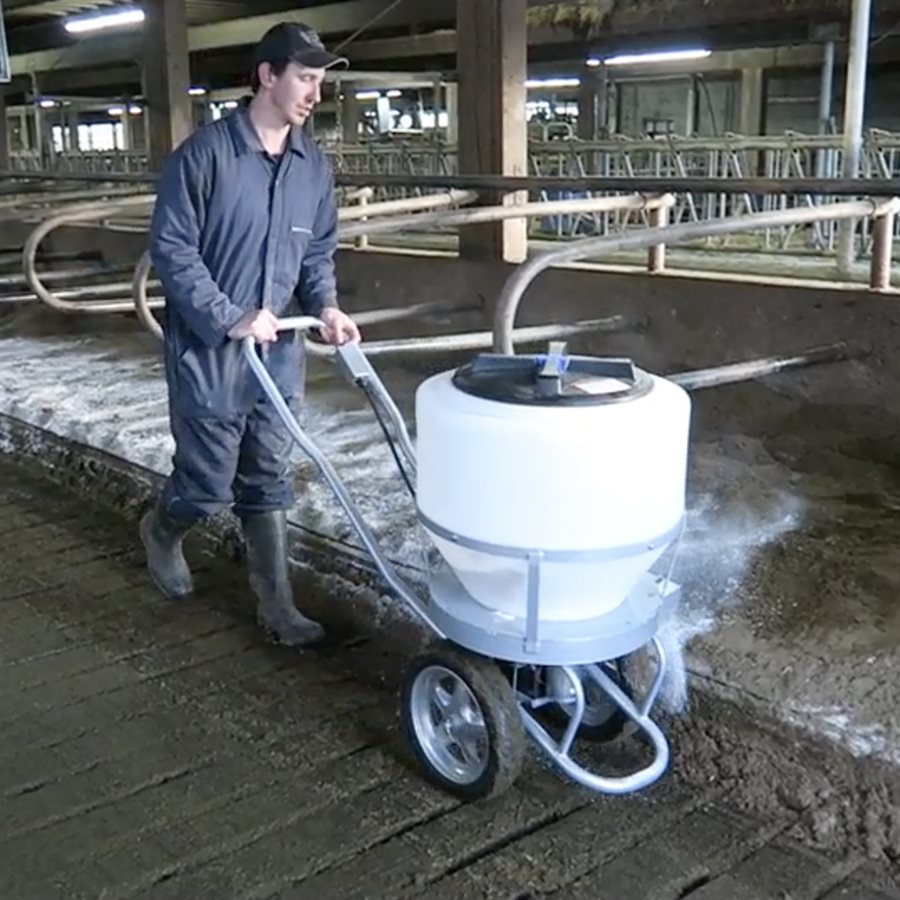 The easy way to spread hygiene drying agents to free stalls. Made of sturdy construction and solid rubber tires with a tank that will hold two bags of product. Adjustment can be made on the distance to throw and the dose rate. Unit operates off battery power that will last up to 2 and 1/2 hours.