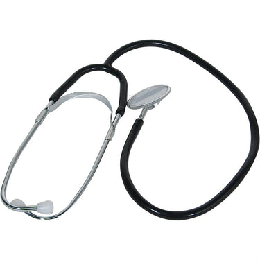 Nickel plated with rubber ear tips. Use to convey sounds of an animal's body to the examiner's ears.